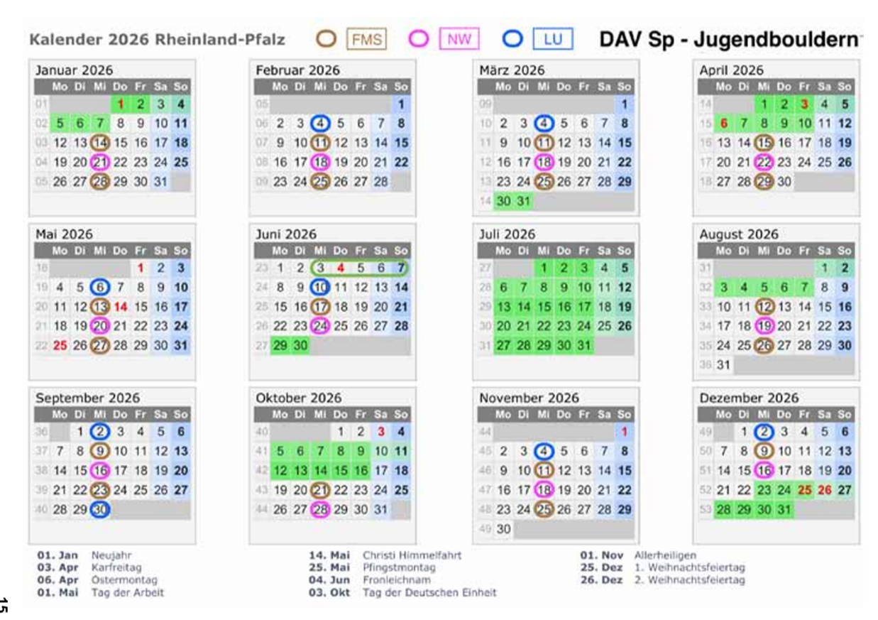 Bouldern für Jugendliche ab 11 Jahren Termin: immer Mittwoch (außer Schulferien RP) Zeiten: FMS Gym.: 18:30 – 19:30 Uhr Neustadt: 17:30 – ca. 20:00 Uhr Ludwigshafen: 17:30 – ca. 20:00 Uhr gem. Jahreskalender 2026